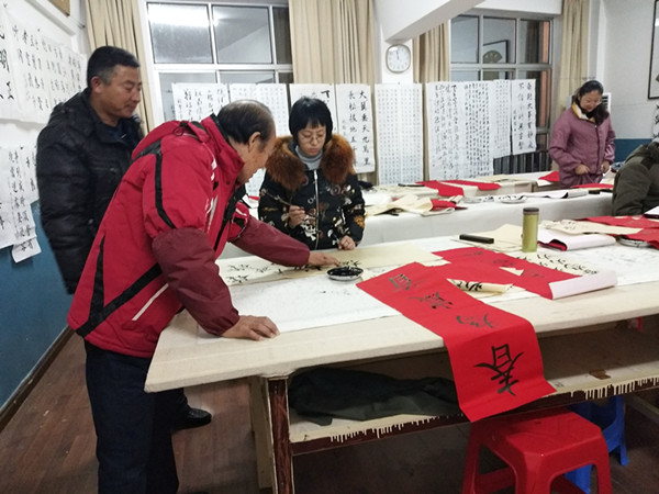 教員黃中村解釋道:“今天是我們進入新年的第一堂課,本學期課程僅剩下了三節,通過這一年的學習,學員們已經掌握了楷書的基本間架結構,你們中的許多人已經可以寫出很不錯的作品,這剩下來的幾節課,我們都練習寫春聯,希望今年我們學員每家都能貼我們自己寫的春聯,并且還能多寫些送給周圍的人。”隨后,他即興示范寫了“梅開春色,家展宏圖”、“春為歲首,梅占花魁”兩幅對子。一手好字,寓意吉祥,引得學員們嘖嘖稱贊。