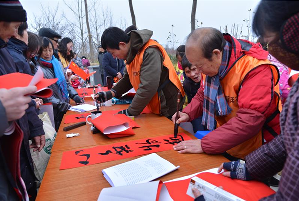 下午3時(shí),場(chǎng)子一鋪開,書法愛好者們揮毫潑墨、筆走龍蛇,不一會(huì)兒,一幅幅珍貴的墨寶便誕生在紅彤彤的正丹紙上,一句句祝福的話語,寄托著職工居民對(duì)農(nóng)歷新年的憧憬和向往。活動(dòng)現(xiàn)場(chǎng),前來領(lǐng)取春聯(lián)的職工居民三五成群,熱鬧非凡,其中,“春回大地,福滿人間”等大紅喜聯(lián)最受歡迎,不一會(huì)兒便被搶選一空。