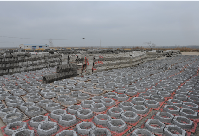 圖為四十六場頭上已經(jīng)堆滿一壟壟的六角塊和六角塊預(yù)制品加工生產(chǎn)時(shí)工人忙碌時(shí)的鏡頭。
