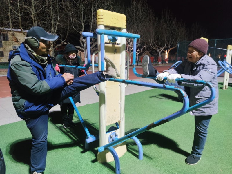 這是在3月2日晚上七點(diǎn)多,在淮海職工休閑體育運(yùn)動(dòng)廣場(chǎng)上,健身達(dá)人周少彪與一位老人進(jìn)行對(duì)話時(shí)的鏡頭。