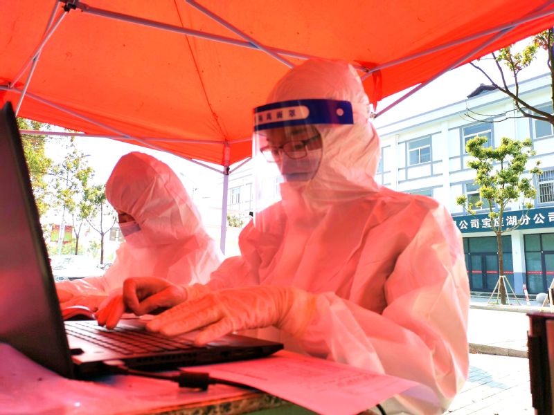 在寶應湖農場固定核酸檢測點,有這樣一群人,他們身穿白色防護服忙著測溫掃碼、維持秩序、采集信息……,“您好請掃一下場所碼,近期沒有外出吧?”“您好,我給您測量一下體溫”“請大家保持一米線,核酸做完及時離開,不交談不聚集”一句句叮囑傳遞著疫情期間的濃濃關懷,在大家的耳畔久久回蕩。