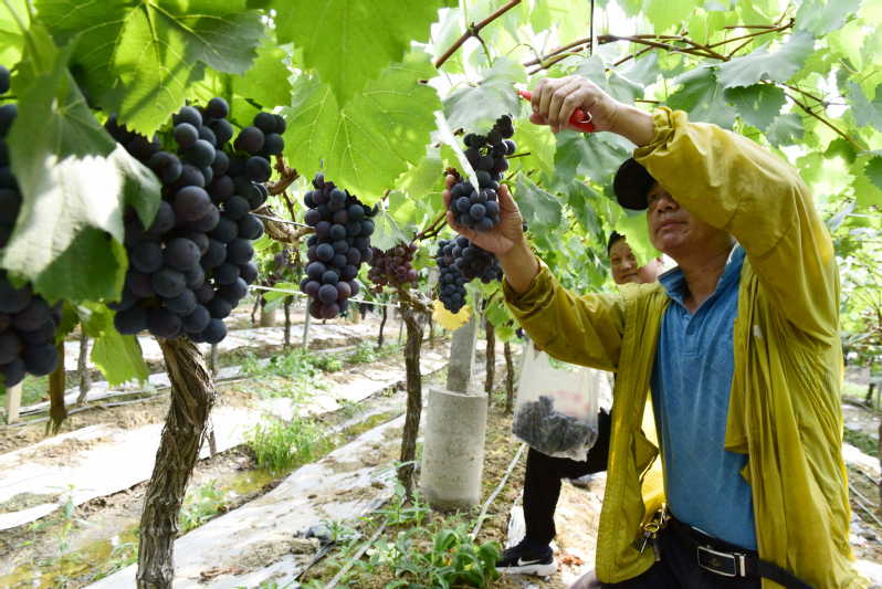 83日,在射陽縣淮海農場高效園區5畝連棟高架大棚葡萄園內,碩大成串的葡萄綴滿枝頭,就連空氣中彌漫著沁人心脾、清新的水果味,經過園區工人的精心培育,一串串綠色或黑色晶瑩的葡萄掛在藤架上,令人垂涎欲滴。入口品嘗,個個飽滿多汁,甜而不膩。慕名來采摘觀光的游客葡萄一邊抬頭觀賞、一邊低頭采摘(如圖),幸福的滋味綻放在臉龐