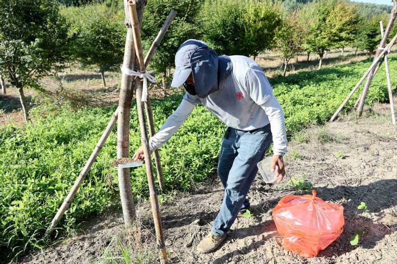 但每年捕捉導致金蟬數(shù)量逐年減少,使得職工收入和林地發(fā)包租金下降,且林地發(fā)包模式單一,林業(yè)經(jīng)濟增長慢。面對這一困境,新曹園林綠化公司積極尋求解決之道。經(jīng)過一系列的研究和考察,公司決定引入金蟬的人工養(yǎng)殖技術(shù)。通過對適宜樹種的選擇以及對特定地塊的精心管理,恢復(fù)金蟬自然種群數(shù)量,提高林地經(jīng)濟效益和社會效益,實現(xiàn)可持續(xù)發(fā)展。“我們選擇在女貞、意楊、垂柳、櫻花等幾個根系發(fā)達、枝條汁水多的樹種下,人工養(yǎng)植金蟬幼蟲,今年試養(yǎng)50畝林地,嘗試連續(xù)試養(yǎng)3年,并做好后期測算和觀察。”黃步林介紹說,“金蟬幼蟲成熟破土大概要3-5年,一般蟬苗的出土率只有10%-15%,平常一棵樹大概投放1-2克苗,也就是4000-8000只,但最終也就出土400-1200只,在豐富的林地資源支撐下,就算只能出土10%,依然具有可觀的經(jīng)濟效益。”據(jù)了解,非養(yǎng)殖的金蟬依靠自然繁殖生長,一般畝產(chǎn)近2000只,凈利潤1500元左右。而人工種植金蟬一般畝產(chǎn)3000只左右,凈利潤2500余元。