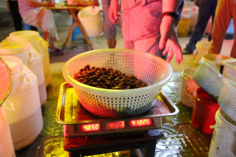 夏夜暑熱退去,新曹農(nóng)場河邊林帶、國道兩側(cè)、集鎮(zhèn)周邊,小樹林里經(jīng)常光影搖曳、星星點點,人們拿著手電筒等照明裝備仔細在每棵樹上尋摸,只為找到獨屬夏季的舌尖美味——金蟬。老百姓熱衷抓蟬、吃蟬,價格由最初的每只0.3元到如今的每只1元左右,10年內(nèi)小小金蟬身價翻了3倍,一躍成為新的致富“頂流”。“金蟬捕捉高峰期能有20多天,一家人一晚可以捉1000多元,每年靠捉金蟬就有近2萬元的收益,我們這一個點一晚收購數(shù)量在5000斤以上,平均價每斤90元以上,年產(chǎn)值900萬元。”金蟬收購點老板何成剛說。