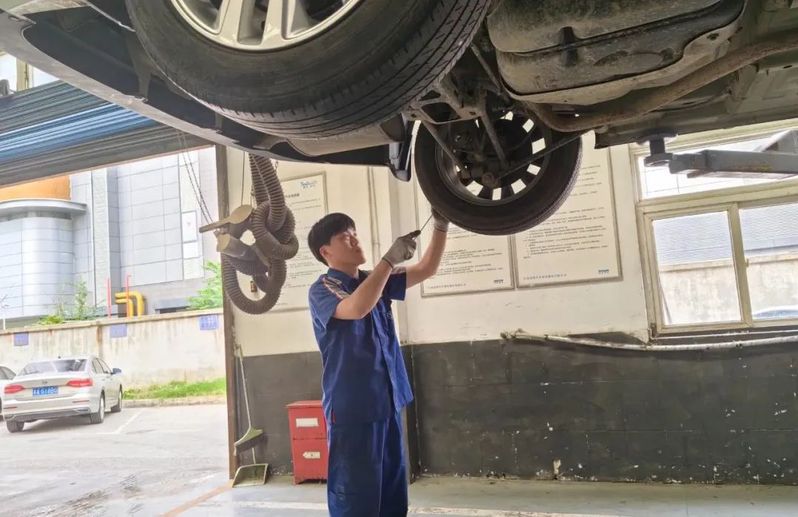 蘇舜汽車公司(上汽大眾4S店)機(jī)電技師周亞威正在為保養(yǎng)車進(jìn)行全車檢查,他認(rèn)真清理著輪胎上的石子,為客戶消除車輛行駛中打滑、漏氣、爆胎等隱患,保障車輛行駛安全。