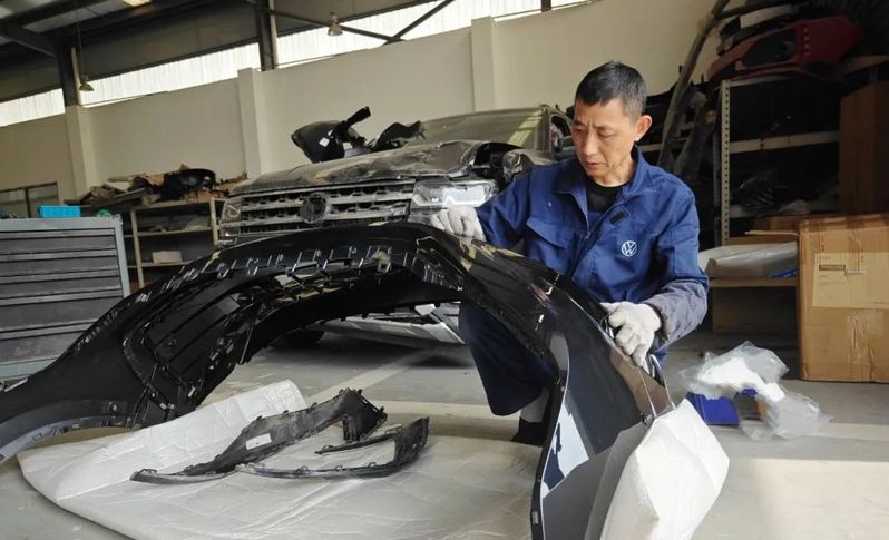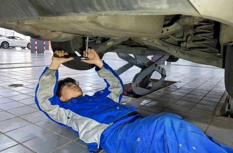 蘇舜元吉公司(上汽大眾4S店)鈑金技師胡同浩斜躺在地上,正在拆卸一輛凌渡車損壞的零件,汗水順著他的額頭流下,他的眼神專注而堅(jiān)定,雙手始終沒(méi)有停歇,確保該車輛維修項(xiàng)目快速、有序進(jìn)行。