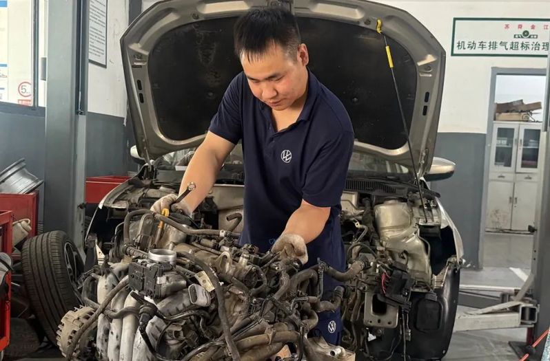 蘇舜金江公司(上汽大眾4S店)機(jī)電技師錢平崗正拆解一輛帕薩特車的發(fā)動(dòng)機(jī),他說(shuō):“客戶著急用車,這個(gè)假期就不休息了,要盡快把車修好。”