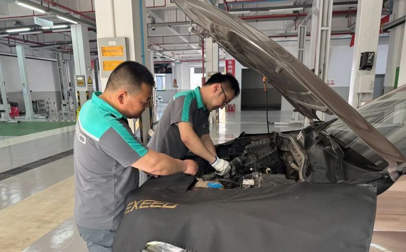 蘇舜舜江公司(上汽榮威、奇瑞星途4S店)技術(shù)經(jīng)理潘學(xué)銀正在指導(dǎo)機(jī)電技師黃楠正在維修一輛因發(fā)動(dòng)機(jī)故障導(dǎo)致無(wú)法正常行駛的車輛,黃楠說(shuō):“修車真的是一項(xiàng)需要經(jīng)驗(yàn)和技術(shù)的工作,每一次操作都是一次挑戰(zhàn)。”