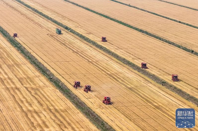5月28日,收割機在三河農(nóng)場收割小麥(無人機照片)。新華社記者 季春鵬 攝