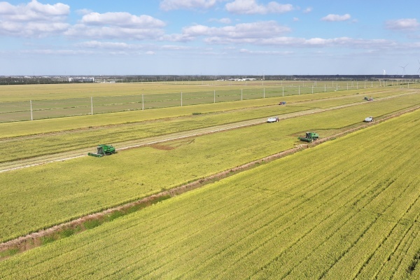 “地里看不到人,但是一切都在掌握。”蘇墾農發臨海分公司副總經理馮衛東沿著田間小路巡視稻田,說起今年的種植、收獲情況了如指掌。他的種田秘籍就是稻田里的攝像頭、空中的無人機。