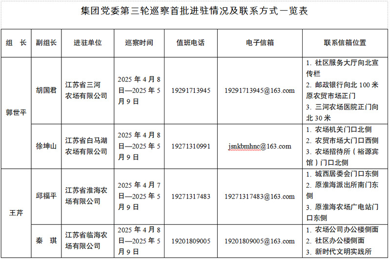 根據(jù)集團(tuán)黨委部署,4月8日,集團(tuán)黨委巡察組已完成對(duì)首批4家被巡察農(nóng)場(chǎng)黨委的進(jìn)駐工作。被巡察農(nóng)場(chǎng)黨委分別召開巡察進(jìn)駐動(dòng)員會(huì)。集團(tuán)黨委巡察組組長(zhǎng)作動(dòng)員講話,深入學(xué)習(xí)領(lǐng)會(huì)習(xí)近平總書記關(guān)于黨的自我革命的重要思想和巡視工作的重要論述,認(rèn)真落實(shí)全省巡視巡察工作會(huì)議要求,通報(bào)本輪巡察工作重點(diǎn)和任務(wù)安排,對(duì)扎實(shí)開展巡察工作提出要求。集團(tuán)黨委巡察組將堅(jiān)持以習(xí)近平新時(shí)代中國(guó)特色社會(huì)主義思想為指導(dǎo),圍繞高質(zhì)量發(fā)展首要任務(wù),把“四個(gè)聚焦”要求貫徹到巡察全過程,緊盯權(quán)力和責(zé)任、緊盯“一把手”和領(lǐng)導(dǎo)班子、緊盯群眾反映強(qiáng)烈的問題,實(shí)行農(nóng)場(chǎng)、分公司、社區(qū)“三位一體”全覆蓋,深入查找影響高質(zhì)量發(fā)展的主要矛盾、落實(shí)改革部署中的重大偏差,推動(dòng)其各項(xiàng)工作高質(zhì)量發(fā)展,為打造“清風(fēng)在田”廉潔農(nóng)墾,譜寫中國(guó)式現(xiàn)代化江蘇農(nóng)墾新篇章提供堅(jiān)強(qiáng)保障。集團(tuán)黨委巡察組將在被巡察農(nóng)場(chǎng)現(xiàn)場(chǎng)巡察1個(gè)月左右,期間設(shè)立專門值班電話、電子信箱、聯(lián)系信箱等,主要受理反映被巡察農(nóng)場(chǎng)黨委領(lǐng)導(dǎo)班子及其成員、相關(guān)重點(diǎn)崗位干部(含已離退休、已調(diào)離)問題的來信來電來訪,重點(diǎn)是關(guān)于違反政治紀(jì)律、組織紀(jì)律、廉潔紀(jì)律、群眾紀(jì)律、工作紀(jì)律和生活紀(jì)律等方面的舉報(bào)和反映。其他不屬