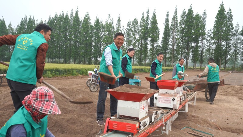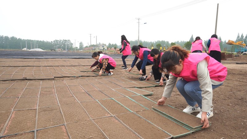 育秧現場,志愿者們分工合作?!绊斶蛇伞敝驹阜贞爜淼搅魉€育秧機前,鏟土、放盤、倒谷,塑料托盤、營養基質、水稻種子依次進入生產線,在設備尾端源源不斷地生產出的標準化盤式苗床?!敖韼健敝驹阜贞犚膊桓适救?,拖車、擺苗床,有條不紊,一盤盤秧盤在田野里成行、成列。“青年員工”志愿服務的小伙子們更是沖鋒在前,兩人一組,鋪設管道……