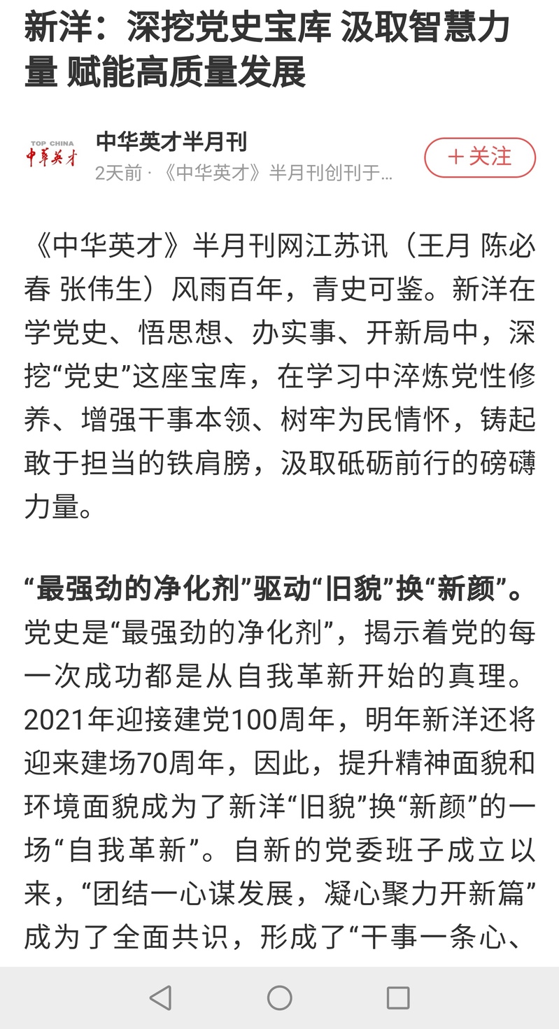 日前,新洋《深挖“黨史”寶庫 汲取智慧力量 賦能高質(zhì)量發(fā)展》一文登上《中華英才》網(wǎng),文章圍繞新洋從黨史學(xué)習(xí)教育中汲取智慧力量,在經(jīng)濟(jì)發(fā)展、環(huán)境提升、為民辦實(shí)事等方方面面煥發(fā)新活力、展現(xiàn)擔(dān)當(dāng)作為、賦能高質(zhì)量發(fā)展。