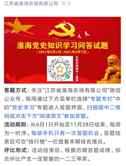 淮海農場公司黨委工作部將在每周一通過農場公司微信公眾號平臺發布當周黨史學習教育答卷考題,分別以單選、多選、對錯題型出現讓大家在參與,回顧黨的光輝歷程,謳歌黨的豐功偉績,為推動淮海高質量發展提供有力保障。據悉,每部手機只有一次答題機會。答題結束后可以在“排行榜”一欄查看自己當期在本周本時段的排名。答題方式:關注“淮海微信公眾號每周通過下方菜單欄進入本周答題頁面進行答題。活動獎勵:將根據答題成績和參賽人員數量最張產生出一定數量的一二三等獎