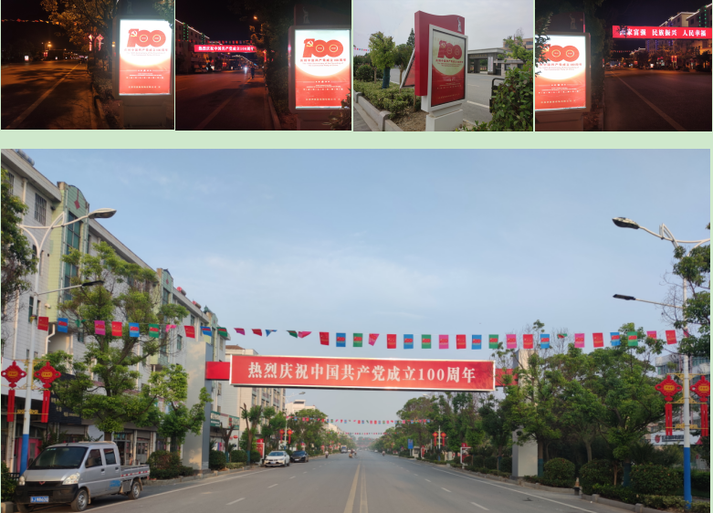 據了解,為了在黨的百年生日這一天,在農場淮海路上營造出濃郁的宣傳氛圍,農場公司通過建造一座跨路燈光宣傳橫幅標語,設置36座路邊黨史及軍墾文化的宣傳燈箱,在路燈之間懸掛“慶祝中國共產黨成立100周年”標識的彩旗,加上懸掛的標語、紅色喜慶的中國結燈飾和夜晚樓宇燈光秀的點綴,將慶祝建黨百年以燈光為主題的宣傳內容,有機融入農場小城鎮的氛圍環境中來,讓淮海農場黨史學習教育宣傳更具特色,通過嶄新的小城鎮面貌,在淮海營造出喜迎中國共產黨成立100周年的良好氛圍。