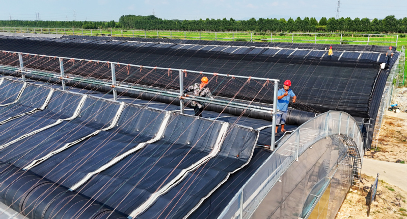 8月12日,在崗埠農場,建筑工人們配合大型吊車,加緊進行糧食烘干倉封頂作業。連日來,施工單位搶抓早晚有利時機,抓緊推進5G+智慧糧倉建設,爭取項目早日建成投產,助力糧食安全。