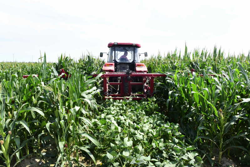 蘇墾農發抓好12萬畝玉米大豆帶狀復合種植精細化管理,在去年成功試驗的基礎上,組織農機對玉米進行去頂,既降低植株高度,減少倒伏風險,又增加了玉米大豆受光面積,促進產量提高。圖為農機在蘇墾農發東辛分公司玉米大豆田間進行玉米去頂作業。